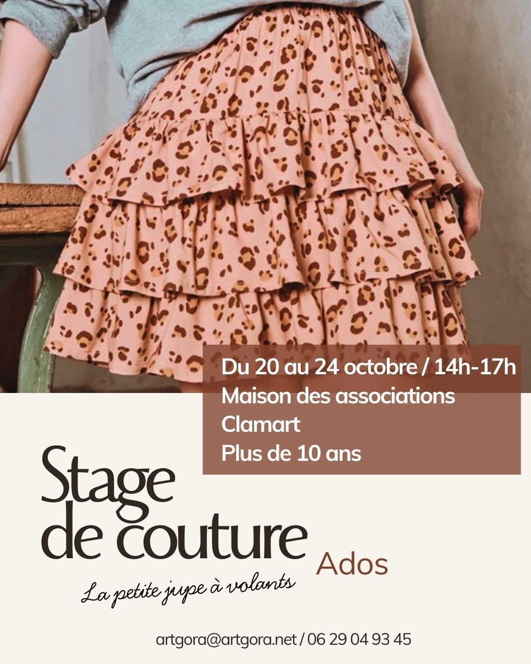 Tu rêves de créer tes propres vêtements et de porter une pièce que tu auras cousue de tes mains ? Pendant les vacances d’automne, Artgora propose un stage de couture spécialement conçu pour les ados. L’objectif : apprendre à réaliser une jolie jupe à volants, tendance et pleine de style.